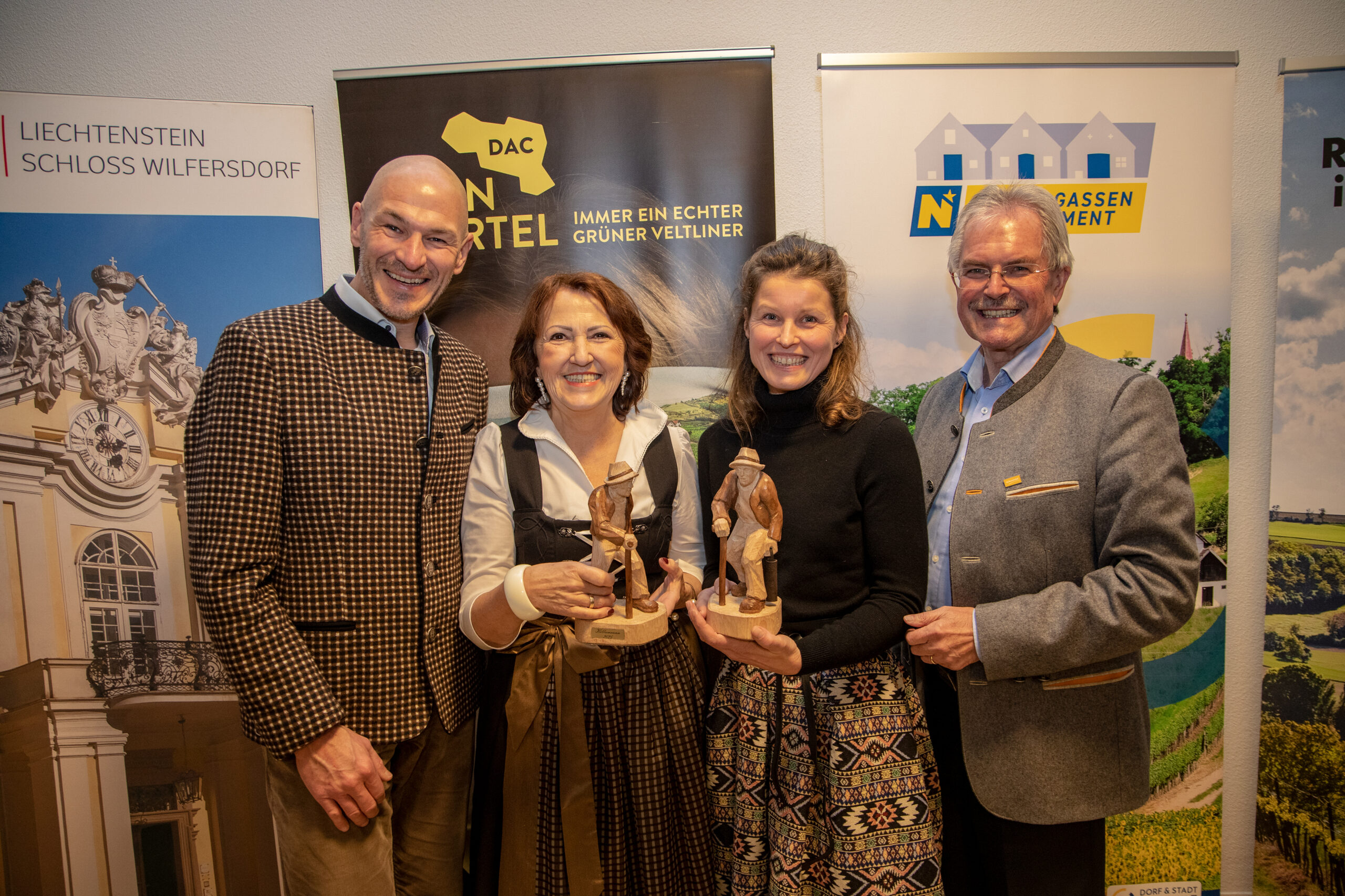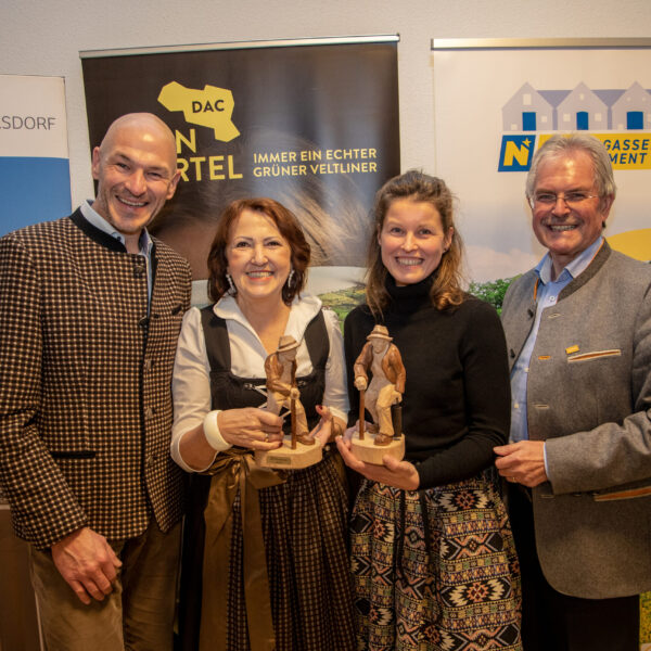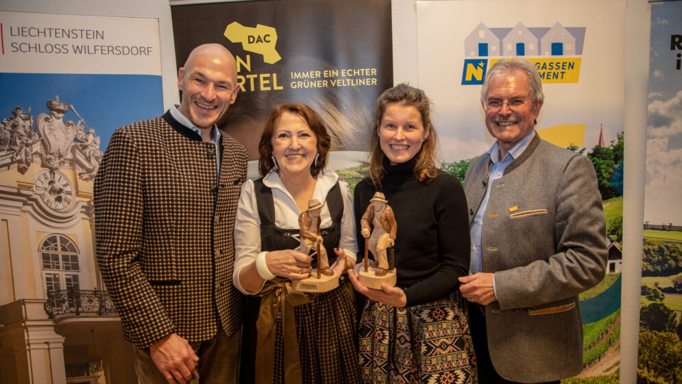 Wilfersdorf – Landtagspräsident Karl Wilfing überreichte an Ilse Gritsch aus Kammersdorf und DI Doris Knoll von der Baudirektion des Landes NÖ die Holzskulptur für den „Köllamaunn 2025“. Zwei Preisträgerinnen sind eine Premiere, denn bisher gab es immer nur einen davon. Beide Damen wurden für ihre in diesem Jahr 2025 erworbenen Verdienste rund um die Kellergassen ausgezeichnet. Die Skulpturen zum Köllamaunn wurde mit freundlicher Unterstützung seitens der Niederösterreichischen Versicherung und des Kulturvereins Schloss Liechtenstein finanziert. Geschnitzt hat den Köllamaunn der Holzkünstler Leopold Schießer aus Röhrabrunn.