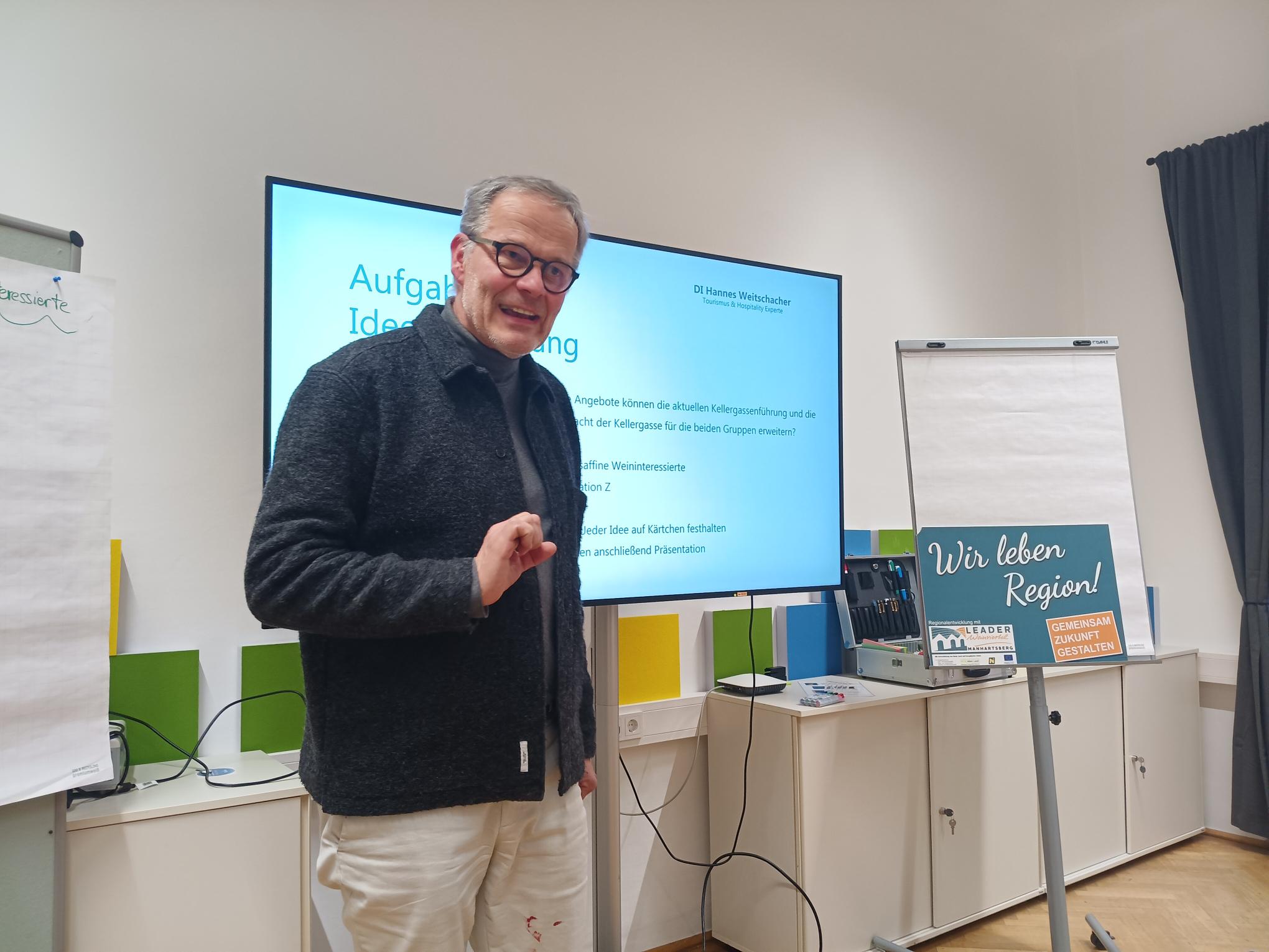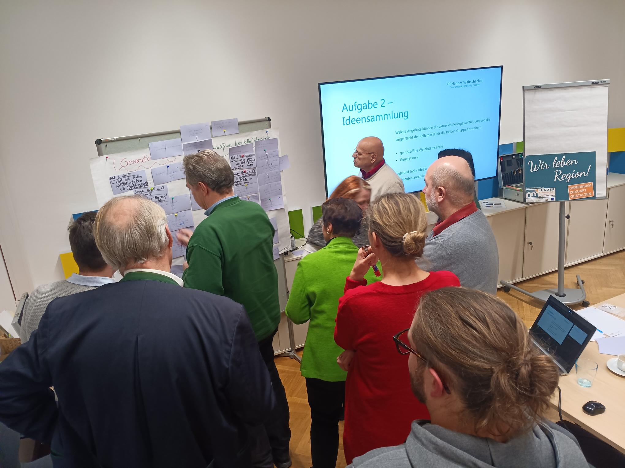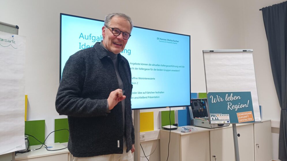 Aus diesem Grund werden in mehreren Workshops mit Akteuren und Spezialisten aus den jeweiligen Bereichen sogenannte „Handlungsleitfäden“ entwickelt. Vom Tourismus-Profi Hannes Weitschacher moderiert, widmete sich der erste Workshop zunächst den „Genussaffinen Personen“, die nicht nur die Kellergassen kennenlernen möchten, sondern vor allem im Bereich des Genusses bei Wein und regionalen Produkten höhere Maßstäbe ansetzen. Wie man dieser Gruppe ein innovatives Angebot schnüren kann, was es dazu braucht und wie man diese Gruppe bedient, wurde im Rahmen des Workshops erarbeitet.